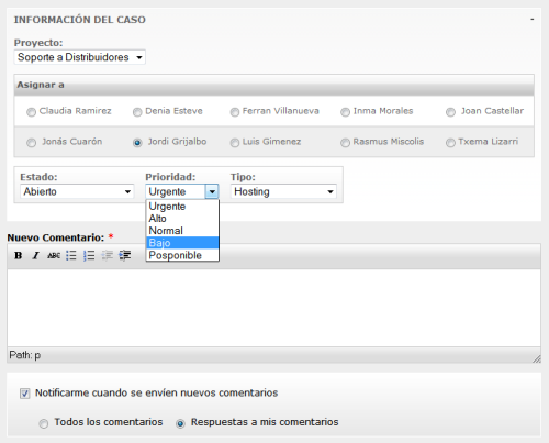 Vemos también en el pantallazo anterior como hemos usado el pequeño módulo "Comment notify" para que cada usuario pueda activar o desactivar en cada momento la posibilidad de que la web nos envíe a nuestro E-mail avisos de que hay comentarios nuevos del equipo por revisar en el histórico de seguimiento de la incidencia.